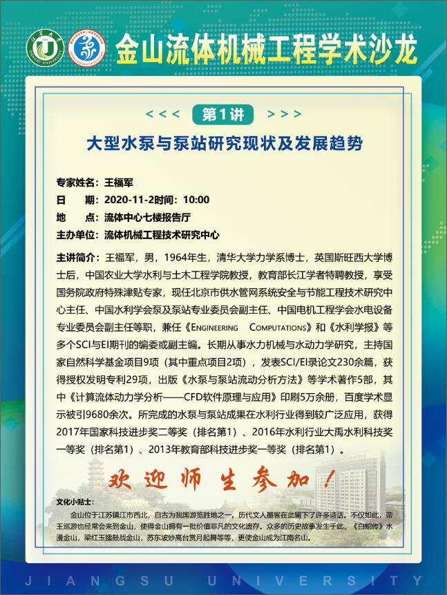 金山流体机械工程学术沙龙(第1讲):大型水泵与泵站研究现状及发展趋势