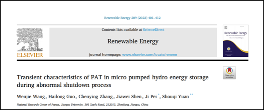 Recently, the Secretariat of the International Eni Award Scientific Committee confirmed that the research achievement "Transient characteristics of PAT in micro pumped hydro energy storage during abnormal shutdown process," published in the leading international energy journal Renewable Energy (IF=8.7) with Jiangsu University as the primary institution, has been nominated for the International Eni Award, becoming one of the candidates for this award in 2024. Wang Wenjie is the first author of the paper, with Pei Ji and Yuan Shouqi serving as corresponding authors.