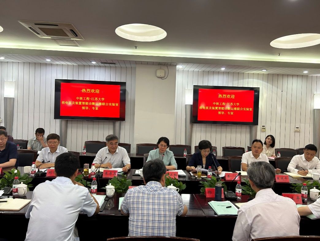 On June 18, the fifth committee meeting of the CNNC-Jiangsu University "Nuclear Power Pump and Device Intelligent Diagnosis and Operation Joint Laboratory" was held in Zhenjiang, Jiangsu. Attendees included Xing Ji, Chief Expert of CNNC; Du Shuhong, Deputy Chief Engineer of CNNC Engineering; Liu Liping, Director of the Science and Technology Department; Song Jianjun, Deputy Director of the Beijing Nuclear Engineering Research and Design Institute; Bai Wei, Director of the Public Systems Department; Qu Changming, Deputy Director of the Systems and Layout Department; Zhang Rongyong, Director of the Cold Source Center; Xing Weihong, President of Jiangsu University; Li Hong, Vice President; Yuan Shouqi, Director of the National Research Center of Pumps; Director Yuan Jianping and relevant department leaders and faculty members of Research Center of Fluid Machinery Engineering and Technology. The meeting was chaired by Vice President Li Hong.