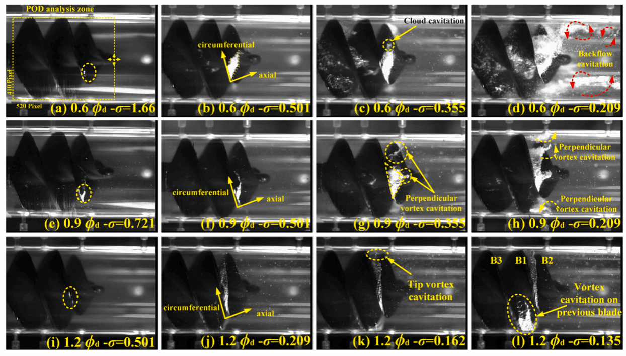The team identified three typical cavitation types in the turbopump inducer under different operating conditions, mapping the cavitation evolution across the full operating range. At 0.6–0.8 Qd, hub-vortex cavitation and backflow-vortex cavitation occur; at 0.8–1.0 Qd, vertical-vortex cavitation is present; and at 1.0–1.2 Qd, swirling-vortex cavitation is observed. Tip-leakage vortex cavitation was found to occur under all operating conditions.