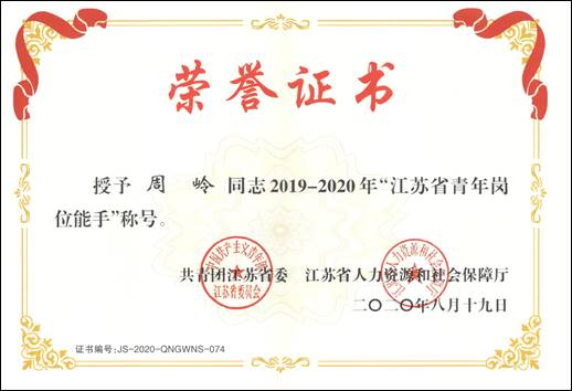 近日,共青团江苏省委、人社厅公布了“2019-2020年江苏省(杰出)青年岗位能手”入选名单,经过广泛申报、审核初评、集中答辩、送审确认、公示复核等程序,共遴选出10名江苏省杰出青年岗位能手、94名江苏省青年岗位能手,其中高校系统仅有4人入选。51吃瓜网 51吃瓜网 周岭副研究员荣获“江苏省青年岗位能手”荣誉称号。