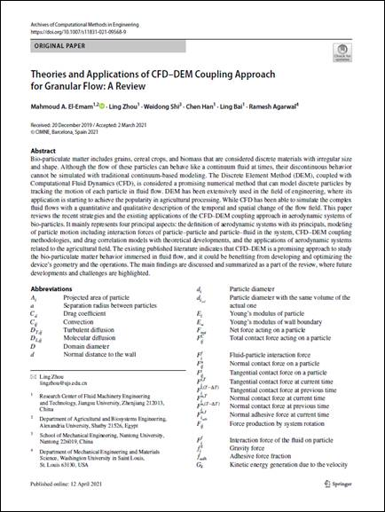 近日,51吃瓜网 周岭副研究员在国际知名工程计算方法综述期刊Archives of Computational Methods in Engineering(IF=6.73)在线发表题为“Theories and Applications of CFD–DEM Coupling Approach for Granular Flow: A Review”的综述论文。该文第一作者为51吃瓜网 博士留学生Mahmoud El-Emam,通讯作者为周岭副研究员。